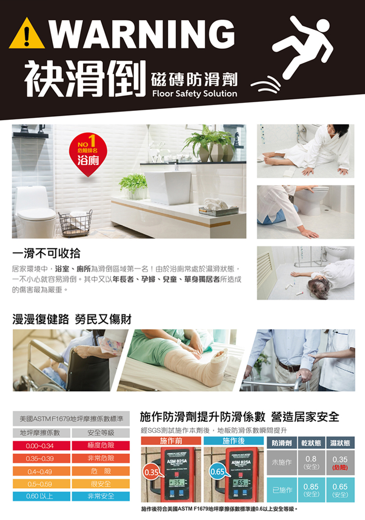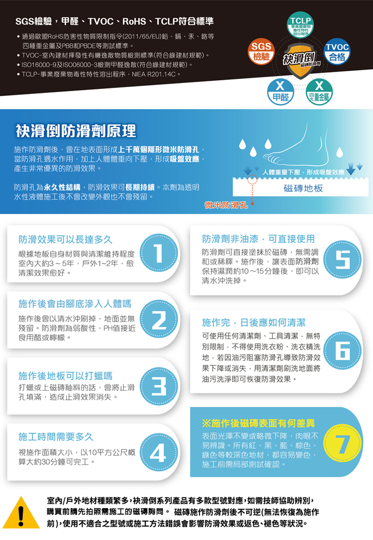 | 產品說明 | 本劑會在地表面形成無數隱形微米防滑孔,利用真空吸盤原理,增加地面摩擦係數,產生非常優異的防滑效果。防滑孔為永久性結構,防滑效果可長期持續。本劑為透明水性液體施工後不會改變外觀也不會殘留。 ※大理石、部份材質會改變。 |