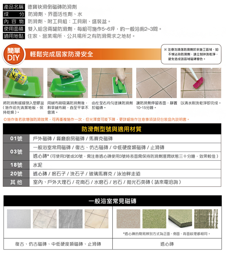 | 注意事項 | 不同材質須使用不同型號防滑劑,敬請來電洽詢。 |