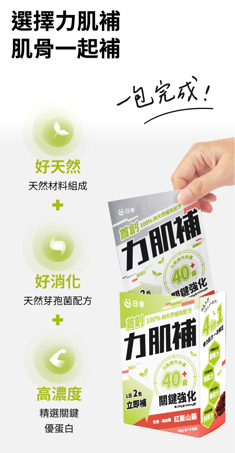分離乳清蛋白、紅棗粉(紅棗粉、玉米澱粉)、赤藻糖醇、愛爾蘭海藻鈣、山藥粉(山藥、玉米澱粉)、黃豆粉、素食胺基酸粉(L-白胺酸、L-α胺基異戊酸、L-異白胺酸、卵磷脂)、天然蕎麥粉(含維生素B群)、BC30專利芽孢乳酸菌(麥芽糊精、芽孢乳酸菌Bacillus coagulans GBI-30,6086)、天然蕎麥粉(含維生素D3)、羅漢果醣苷萃取物(羅漢果醣苷萃取物、麥芽糊精)