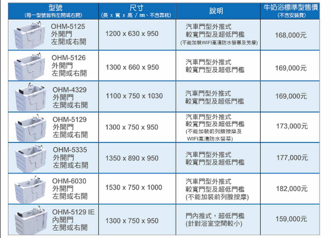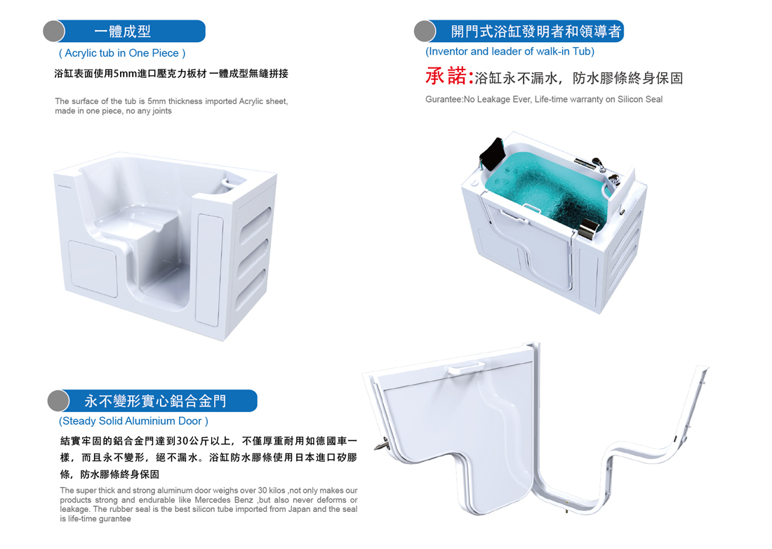 ★基本款標配:厚實壓克力缸體、201不鏽鋼底架、實心鋁合金浴缸門框、內扶手、快速排水器、高流量水龍頭、頭枕