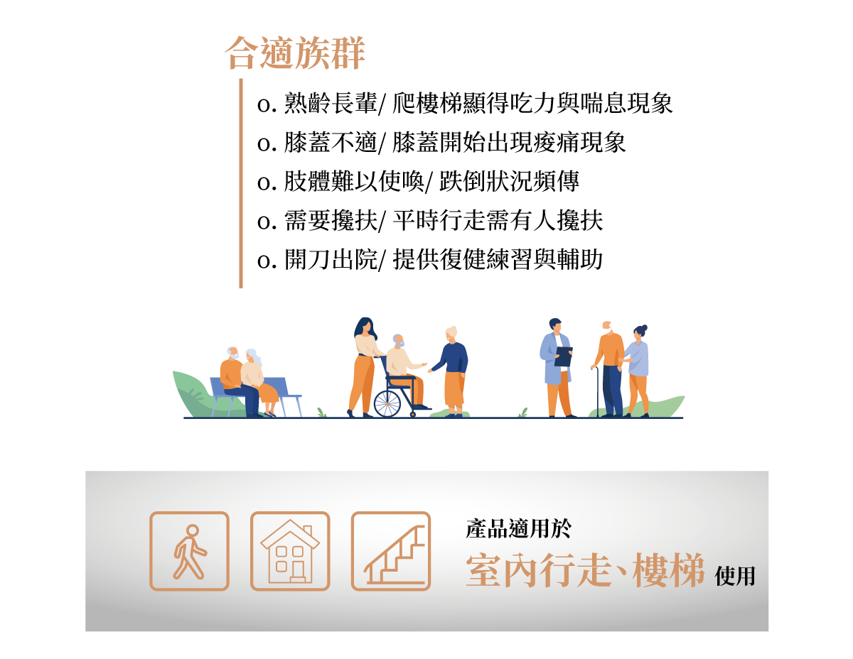 ★ 上下樓梯使用不同的把手,雙把手設計可以輕鬆分別使用於上樓或下樓。