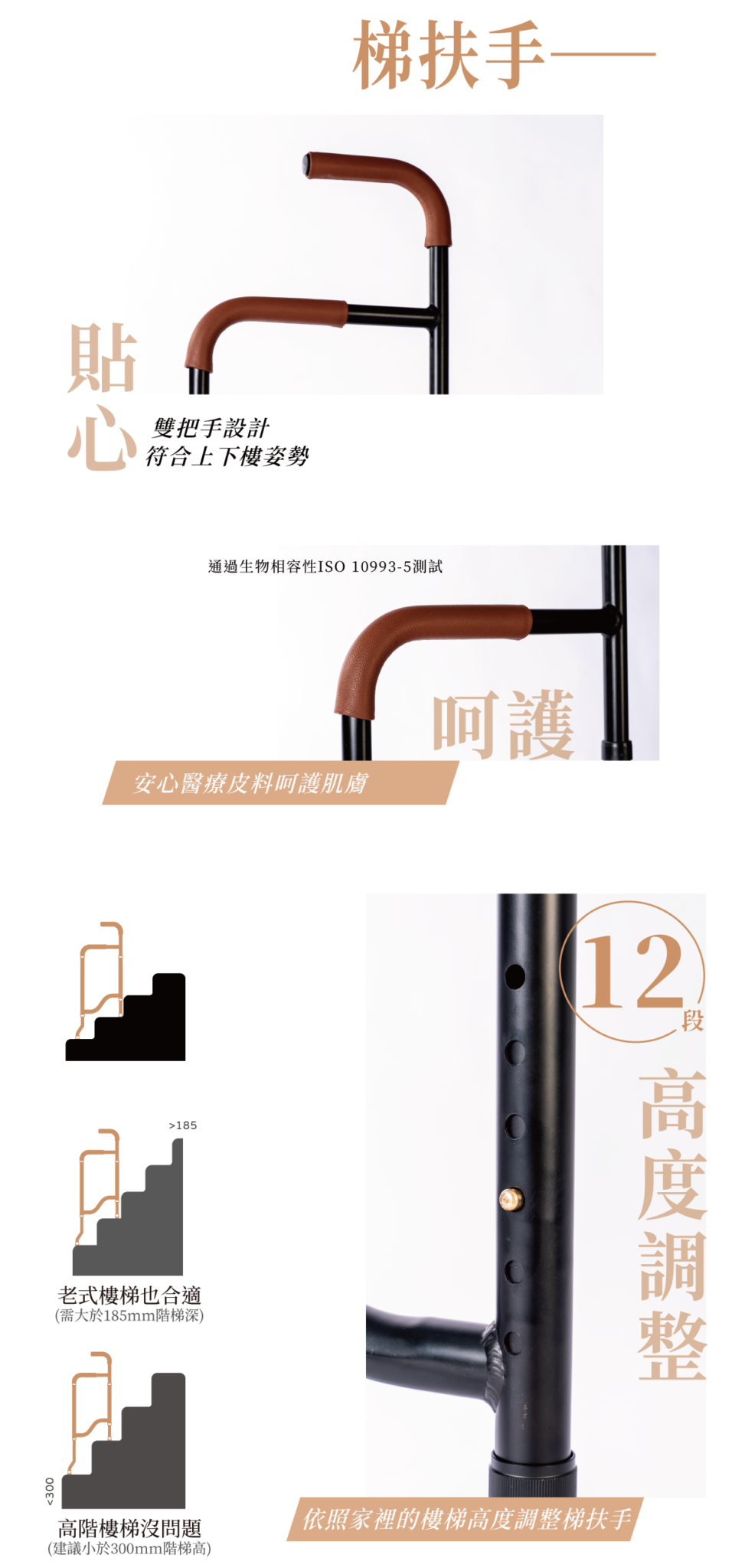 ★ 杖腳可十二段自由調整高度,可適應不同型態的樓梯型態。