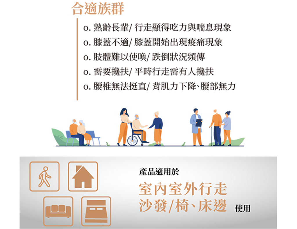 • 輔助室內外出行走、床架起身、馬桶&座椅起身等。