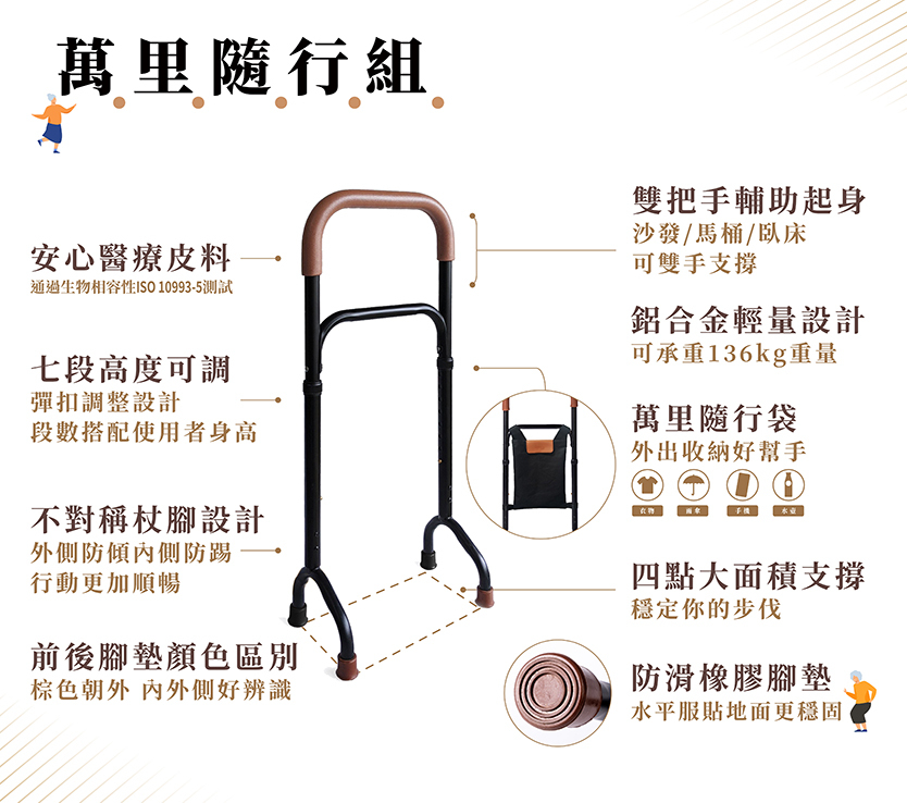 • 助步器/拐杖/起身扶手三合一功能,CP值破表。