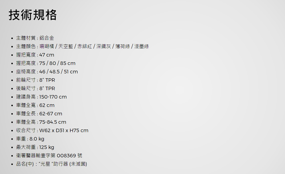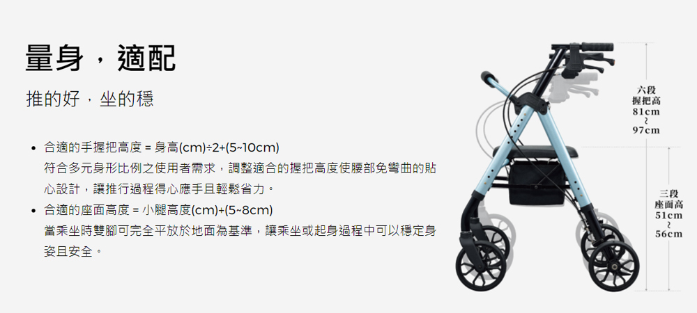 ★ 握把、座面高度可量身調整,建議適用身高 150-170cm,最大荷重125kg