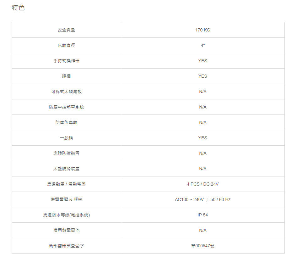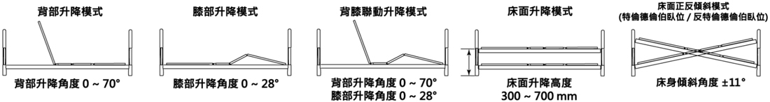 ★ 五大功能模式,背部傾斜/膝部傾斜/背膝聯動/床面升降/特倫德倫伯臥式(Trendelenburg)。