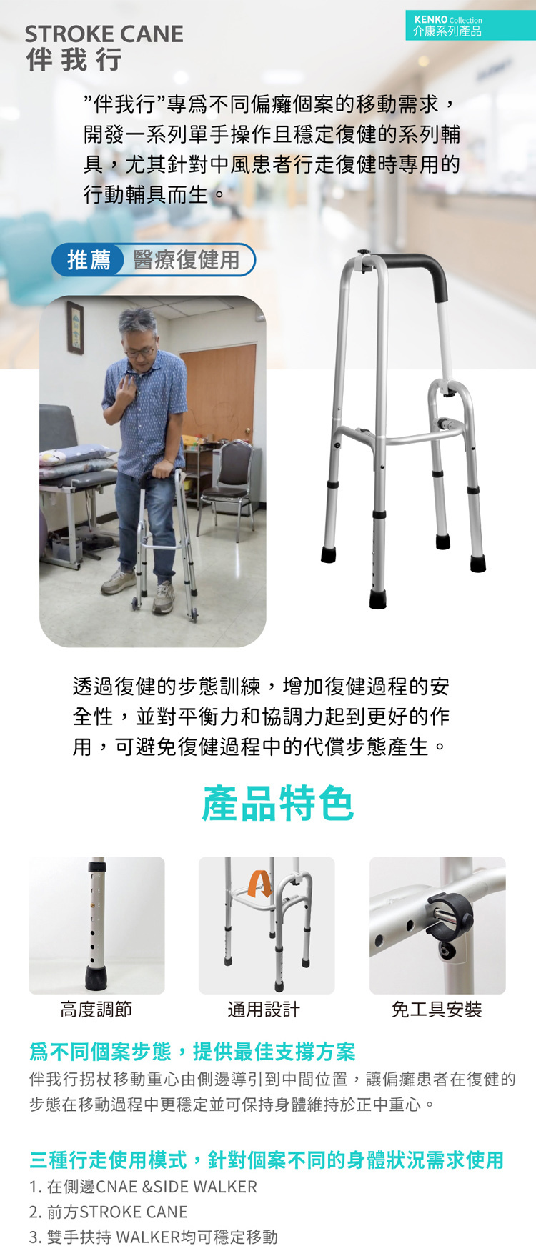 ★ 三種行走模式,針對個案不同的身體狀況需求