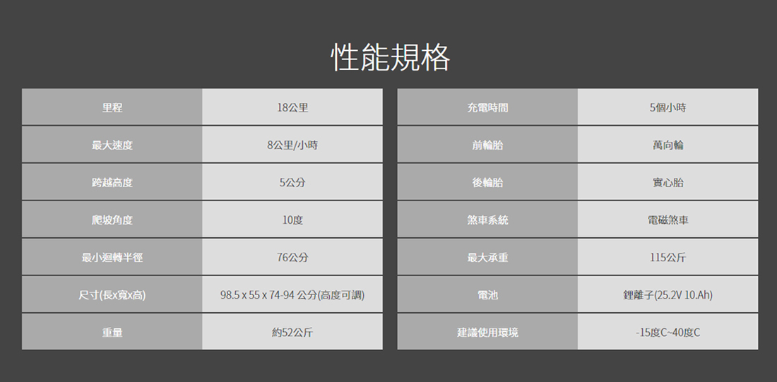 ★ 最大承重115,充電5小時可連續行駛18公里,時速最高8公里。